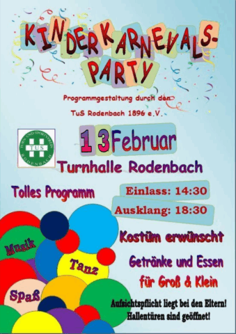 am 13.02.2026Bereits zum vierten Mal richtet der TuS Rodenbach seineKinderkarnevalsparty aus. Nachdem im letzten Jahr die Veranstaltung so einengroßen Anklang fand und die Halle wieder zu klein war für die vielen Besucher,richten wir auch in diesem Jahr die Kinderkarnevalsparty aus. Es werden wieder viele Tanzgruppen vor Ort sein, seien esdie Piccolos… Kinderkarneval<br>am 13.02.2026<br><br><!–EndFragment–> weiterlesen - Jahresabschlussbericht