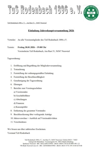 - Jahreshauptversammlung 2026Sehr geehrte Mitglieder des TuS Rodenbach,hiermit laden wir euch zur Jahreshauptversammlung am 30.01.2026, 19.00 Uhr auf dem Sportplatz ein.Über zahlreiches Erscheinen würden wir uns sehr freuen.Wir wünschen Euch und euren Familien frohe Weihnachten und einen guten Rutsch ins neue Jahr.Euer Vorstand TuS Rodenbach